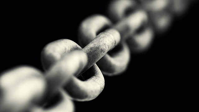 Strong chain black background concept abstract single line streaching from bottom left to top right. selective focusing on one of the chain links.
