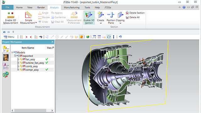 JT2Go桌面应用程序提供了所有支持平台中丰富的特性集。桌面应用程序不仅会显示.jt文件,还会显示在Siemens PLM的旗舰产品Teamcenter可视化产品中创建的.vfz会话文件。
